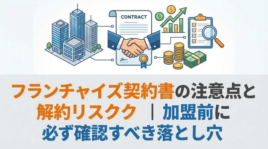 フランチャイズ契約書の注意点と解約時のリスクを、5ブランド加盟経験者・富永康太が実体験をもとに解説。違約金・縛り期間・撤退時の条件など、加盟前に絶対確認すべきポイントをまとめています。