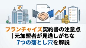 FC契約書で確認すべきポイントの一覧はこちらにまとめています。採用ルール・撤退条項の確認箇所もリスト化しています。